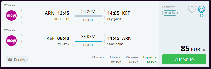 Näidiskuupäevad Stockholmist Reykjaviki (kliki linkil):