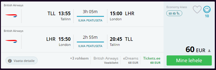 British Airways avab järgmisel aastal uue lennuliini Tallinna ja Londoni vahet. Edasi-tagasi lennupiletid Tallinnast maksavad alates 60 eurost! Soodsad lennud on saadaval lendamiseks teisipäeviti ja laupäeviti.