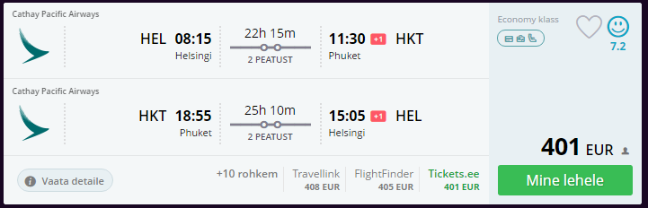 Cathay Pacific pakub soodsaid lennupileteid Helsingist Phuketisse alates 397 eurost! Pileteid leidub aprilli lõpust juuni keskpaigani augusti keskpaigast detsembri keskpaigani. Alla 400 euroseid pileteid leidub just sügiseks!