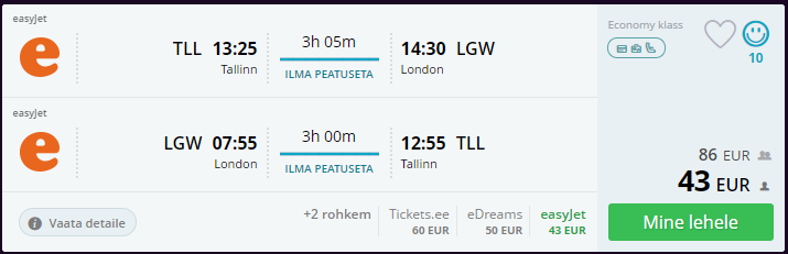 Mõned näidiskuupäevad lendamiseks Tallinn-London-Tallinn:
