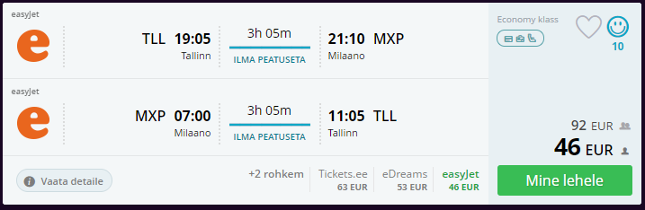 Mõned näidiskuupäevad lendamiseks Tallinn-Milano-Tallinn: