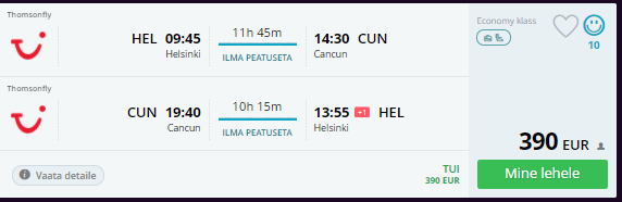 TUI pakub soodsat lendu Helsingist Mehhikosse Cancuni hinnaga 390 eurot.