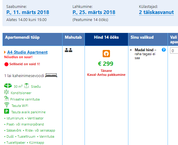 Soodsalt saab antud perioodil ööbida majutusasutuses Condo 42. Apartmendi hind kahele 14 ööks tuleb 299 eurot ehk ca 150 eurot inimese kohta. Vaata lähemalt SIIT