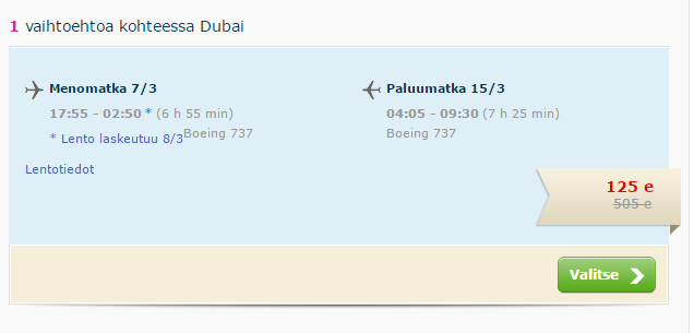 Hetkel on saadaval soodne viimase hetke pakkumine Helsingist Dubaisse 65 euro eest.