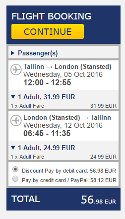 Broneeri piletid www.ryanair.com. Hind sisaldab käsipagasit mõõtmetega (55cm x 40cm x 20cm).