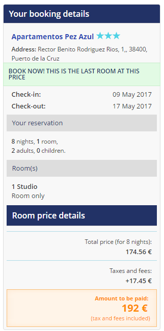 Soodsalt saab perioodil 9-17. mai ööbida Apartamentos Pez Azul, mis asub Puerto de la Cruzi linnas, kuhu on mõistlik minna, kui plaanid rentida auto. Kahese toa hind tuleb 192 eurot ehk 96 eurot inimese kohta (koos hommikusöökidega 248 eurot ehk 124 eurot inimese kohta). Broneeri tuba SIIT. Puerto de la Cruzi on ca 1h sõitu Tenerife South lennujaamast. Loe SIIT, kuidas sinna saada.