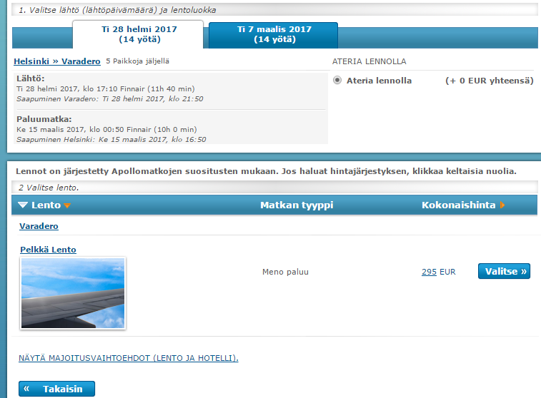 Hetkel on saadaval Apollomatkate poolt korraldatud soodne viimase hetke lennupakkumine Helsingist Varaderosse 295 euro eest.