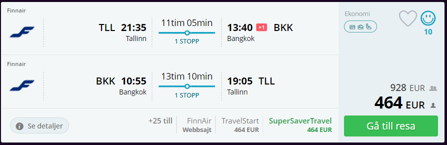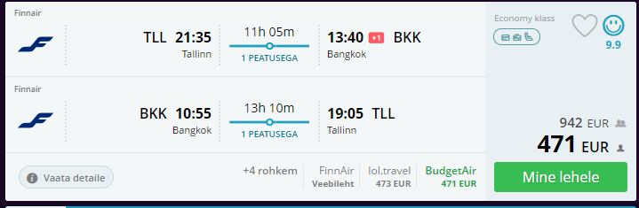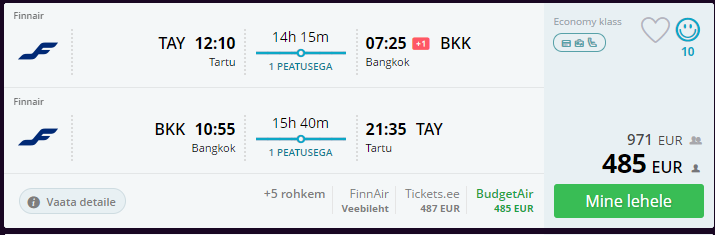 Finnair pakub soodsaid ja mugavaid lennupileteid Tai pealinna Bangkokki. Edasi-tagasi lennupiletid algusega Tallinnast ja Tartust alates 464 eurost! Pileteid leidub lendamiseks novembrist detsembrini ja märtsist aprillini. Pakkumine kehtib kuni 10. oktoobrini.