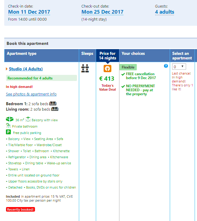Majutuse hinnale lisandub kohapeal tasutav turismimaks 220 CVE päevas (ca 2 eurot) inimese kohta.