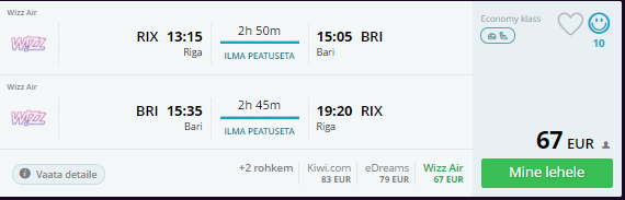 Näidiskuupäevad lendamiseks Riiast Barisse ja tagasi: