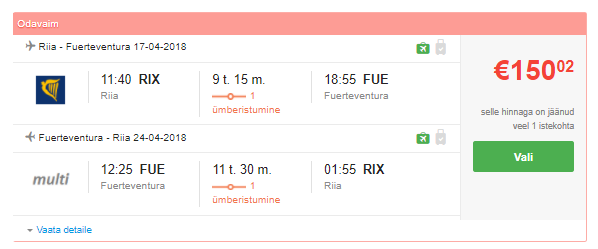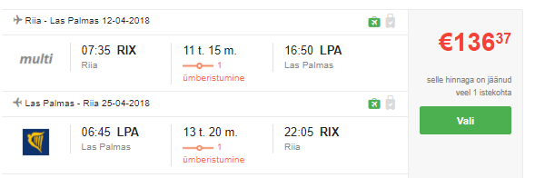 Kombineerides erinevaid lende on võimalik lennata kevadel Riiast ühe ümberistumisega Kanaari saartele. Edasi-tagasi lennud Riiast algavad 175 eurost!
