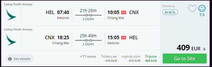 5-tärni lennufirma Cathay Pacific pakub soodsaid lennupileteid Helsingist Chiang Maisse. Edasi-tagasi lennupiletid algavad 412 eurost! Kõrghooajaks peetakse Tais perioodi novembrist märtsini.