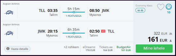 Puhka mai lõpus või juunikuus Mykonose saarel Egeuse meres – edasi-tagasi lennupiletid Tallinnast alates 161€! Enamus kuupäevadel tähendab soodsam lennuvariant, et on võimalik päev veeta ka Ateenas.