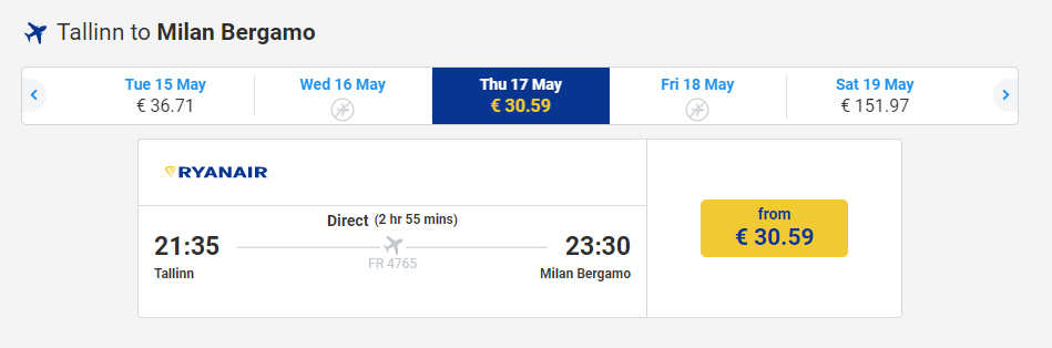 17.05 Tallinn – Milan [21:35 – 23:30] 30€