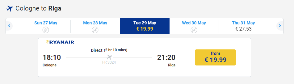29.05 Cologne – Riia [18:10- 21:20] 20€