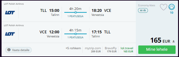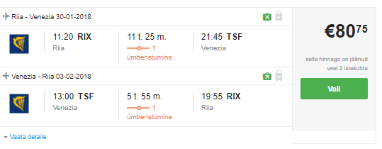 Kombineerides erinevaid lende saad lennata Riiast ja Tallinnast Veneetsiasse hinnaga alates 79 eurost. Veneetsias toimub karneval 27. jaanuarist kuni 13. veebruarini, loe lähemalt SIIT