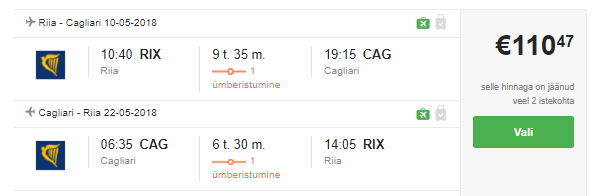 8. mai Riia – Catania (63€) ja 22. mai Palermo – Riia (63€)