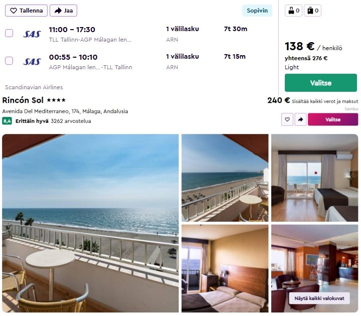 23. – 28. märtsil saab hea hinnaga ööbida 4-tärni hotellis Rincon Sol, mis asub Rincón de la Victoria ranna ääres, 10 km Malagast. Kohapeal on võimalik jalgrattaid laenutada ning piirkonnas saab harrastada golfimängu, tennist ja padeltennist. Kaheinimese toa hind 5 ööks maksab 240 eurot (valida tuleb sembo.fi, hind langeb maksmisel). Pane tähele, et ca 80 eurot kõrgema hinnaga on saadaval ka merevaatega tuba.