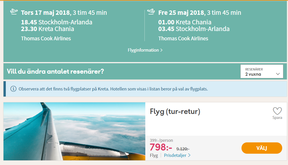 Reisikorraldaja Ving pakub Stockholmist hea hinnaga edasi-tagasi otselendu Kreetale. Võttes juurde omale merevaatega korteri, saab reisida väga soodsa hinnaga maikuus Kreetale.