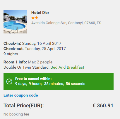 Perioodil 16 – 25. aprill saab soodsalt ööbida Hotel d’Or Santanyi, mis asub Cala d’Oris. Kahese toa hind koos hommikusöökidega 9 ööks tuleb 360,91 eurot ehk ca 180 eurot inimese kohta. 19-25. aprill tuleks hotelli hinnaks 234 eurot ehk 117 eurot inimese kohta. Vaata lähemalt SIIT