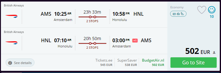 Kombineerides erinevaid lende (British Airways, Airbaltic) on võimalik lennata Tallinnast Honolulusse (Havai) hinnaga 661 eurot! Pakkumisi leiab veebruaris, märtsis, novembris ja detsembris.