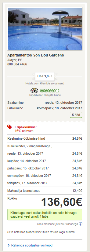 13-18. oktoober saab soodsalt ööbida majutusasutuses Apartamentos Son Bou Gardens, mis asub rannast 11-minutilise jalutuskäigu kaugusel. Hotellis on välibassein ja Vahemere-stiilis aiad. Läheduses asub palju poode ja restorane. Kahe magamistoaga külaliskorteri hind 5 ööks tuleb 136,6 eurot ehk neljakesi ööbides ca 34 eurot inimese kohta. Vaata lisa SIIT