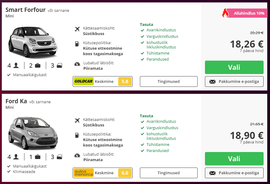 Menorcal on autorent väga soodne. 7 päeva hinnad algavad ca 18 eurost. Vaata SIIT
