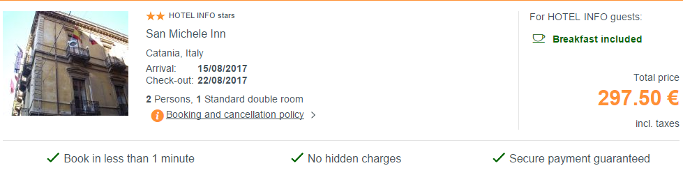 Catanias saab mõlemal perioodil hea hinnaga ööbida hotellis Hotel San Michele Inn, mis asub 12 minutit jalgsi rannast ning 2 minutit populaarsest ostlemistänavast. Kahese toa hind 8 – 15. august tuleb 307,5 eurot ning 15-22. august 297,5€. Hind sisaldab ka hommikusööke. Vaata lähemalt SIIT