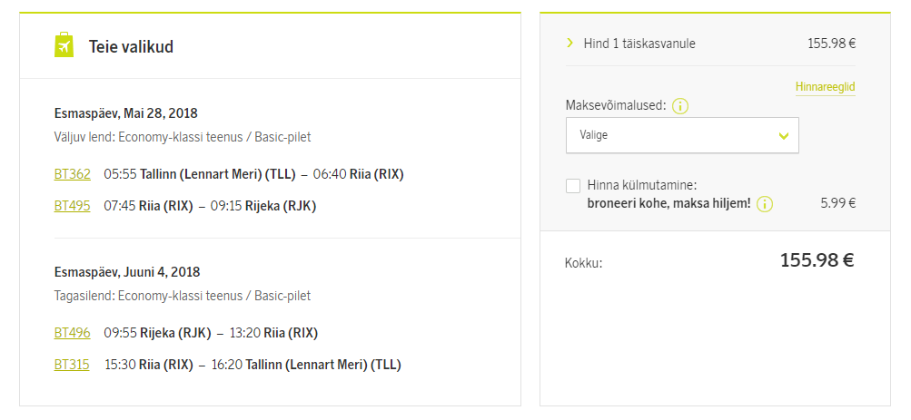 Näidiskuupäevad lendamiseks (Tallinn – Rijeka – Tallinn):