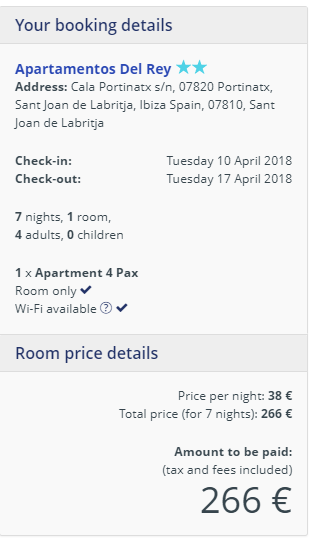 10 – 17.04 saab soodsalt ööbida Portinatx’s asuvas korterhotellis Apartamentos Del Rey, mis asub rannast 1-minutilise jalutuskäigu kaugusel. Ühe magamistoaga korteri hind neljale tuleb 266 eurot ehk ca 67 eurot inimese kohta. Loe lähemalt SIIT