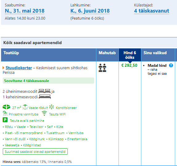 Õige lause on: stuudiokorteri hind neljale tuleb 31. mai – 6. juuni 292,5 eurot ehk ca 73 eurot inimese kohta. Täname tähelepanu juhtimast!