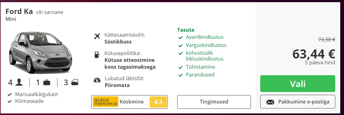 Autorenti saarel vaata SIIT. Näiteks 19-24. juuni otse lennujaamast võttes maksab auto 5 päevaks 63,44 eurot ehk neljakesti reisides ca 16 eurot inimese kohta.