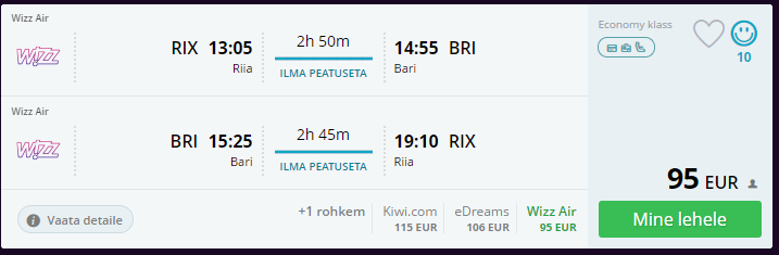 Lennufirma Wizzair pakub suvel teatud kuupäevadeks väga soodsaid otselende Riiast Lõuna-Itaaliasse Apuulia maakonda, Bari lennujaama. Hinnad edasi-tagasi lendude eest algavad 95 eurost!