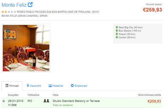 Soodsalt saab ööbida Gran Canaria 3-tärni (süsteem näitab ekslikult 2 tärni) hotellis Monte Feliz, mis asub rannast 4 minuti kaugusel. Neljakesi reisides on kahe magamistoaga korteri hind perioodil 26.01 – 06.02 (11 ööd) ca 240 eurot inimese kohta, vaata lähemalt SIIT. Perioodil 19-25.01 (6 ööd) oleks hind 127 eurot inimese kohta.
