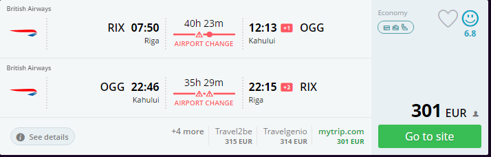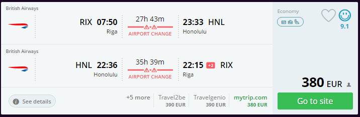 Lennufirma British Airways pakub soodsaid lennupileteid Riiast Havaile 301 euroga! Reis eeldab lennujaama vahetust Londonis ja teatud kuupäevadel ka ööbimist Londonis või Los Angeleses.