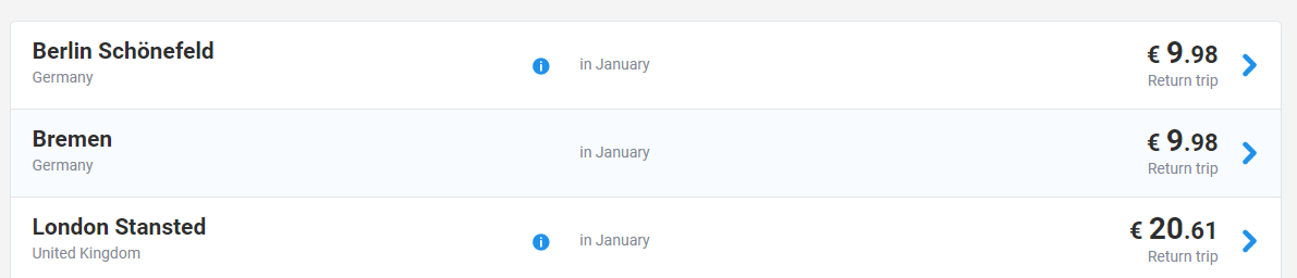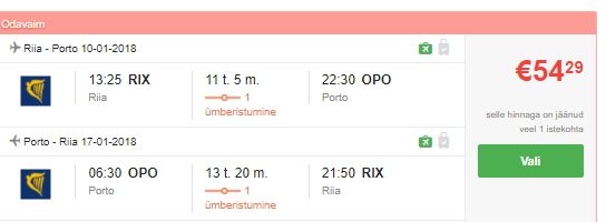 Tänu soodsatele piletitele saab hea hinnaga lennata ka näiteks Riiast Portosse 10 – 17.01 (54€) või Lõuna-Portugali, Farosse 30.01 – 06.02 (89€) [vali filtris tingimuseks ‘Öötranfeere ei ole’]