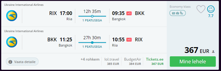 Hetkel saab osta soodsalt lende sügishooajaks Taisse: nimelt Ukraine International Airlines pakub lende Riiast Bangkokki 374 euroga! Tagasiteel tuleb öö veeta Kiievis, mis annab võimaluse lühidalt linnaga tutvuda.