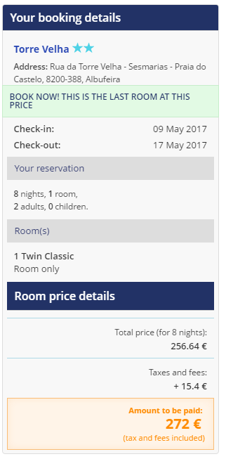 9 – 17. mai saab soodsalt ööbida: Albufeira hotellis Torre Velha. Kahese toa hind tuleb 272 eurot ehk 136 eurot inimese kohta (hommikusöökidega 153 eurot inimese kohta). Vaata lähemalt SIIT