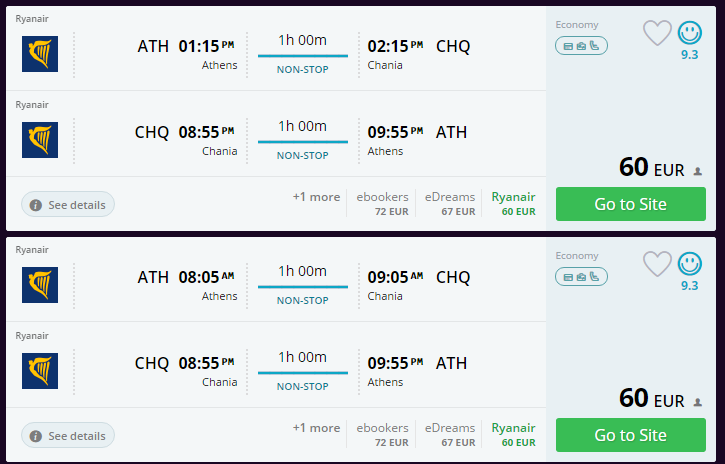 Tallinn – Ateena – Chania suunal on võimalik Ateena lennujaamas ümber istuda kella 08:05-sele lennule (ümberistumise aeg 1 tund 5 minutit) või 13:15-sele lennule (ümberistumise aeg 6 tundi 10 minutit). Hind on sama. Tunnist peaks piisama, kuid igaks juhuks soovitatakse 1,5 – 2 tundi. Loe lähemalt näiteks SIIT