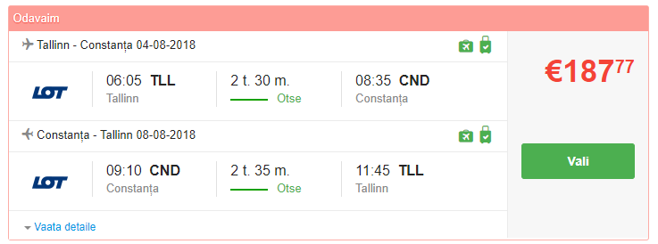 Kodumaine lennufirma Nordica lennutab südasuvel Tallinnast Rumeenia Musta mere kuurorti Constanțasse. Edasi-tagasi lennud maksavad 188 eurot. Lisades korraliku rannalähedase majutuse, saab näiteks 3 ööd ja lennud kokku 258 euroga inimese kohta. Nädala puhul algaks hind koos lendudega 352 eurost!