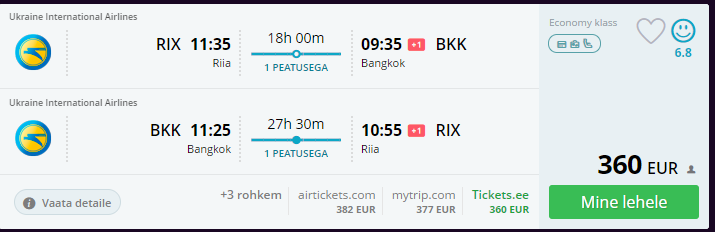 Lisaks eilsele soodsale võimalusele lennata Tallinnast Bangkoki 362 euroga (vaata SIIT) pakub lennufirma Ukraine International Airlines soodsaid lennupileteid Riiast Tai pealinna, Bangkoki hinnaga alates 360 eurost!