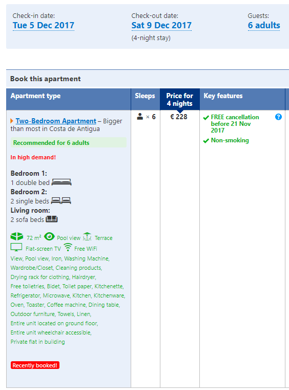 Perioodil 5 – 9. detsember saab soodsalt ööbida hotellis Apartamento Costa Golf. Kahe magamistoaga apartmenti hind 4 ööks tuleb 228 eurot ehk 38 eurot inimese kohta. Korteris on viis voodit. Vaata lisa SIIT