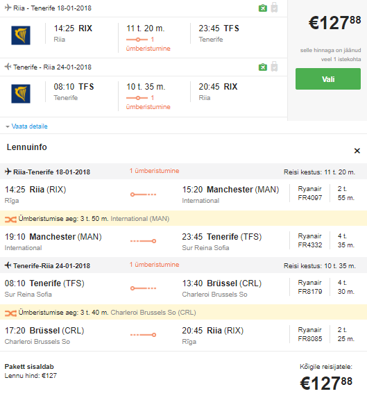 Minnes on ümberistumine 3h 50m Manchesteris, tulles 3h 40m Brüsselis. Parim lennuvõimalus pole järjekorras esimene.