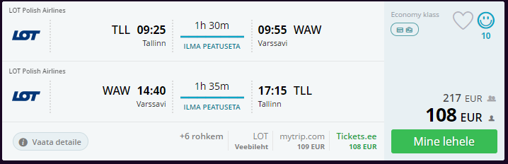 LOT pakub soodsaid otselende Tallinnast Varssavisse hinnaga alates 89 eurost! Pileteid leidub igaks ajaks, kuid oktoobrist detsembrini on hinnad kõige soodsamad! Muul ajal on hind ca 10 eurot kõrgem.