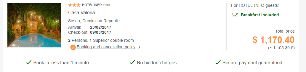 Antud perioodiks (23.02-09.03) on näiteks saadaval Casa Valeria, mis asub rannast 4-minutilise jalutuskäigu kaugusel. Puerto Plata asub Sosuast ca 25 km kaugusel. Kahese toa hind tuleb 1105 eurot ehk ca 553 eurot inimese kohta. Hinna sees on ka hommikusöögid. Vaata lähemalt SIIT