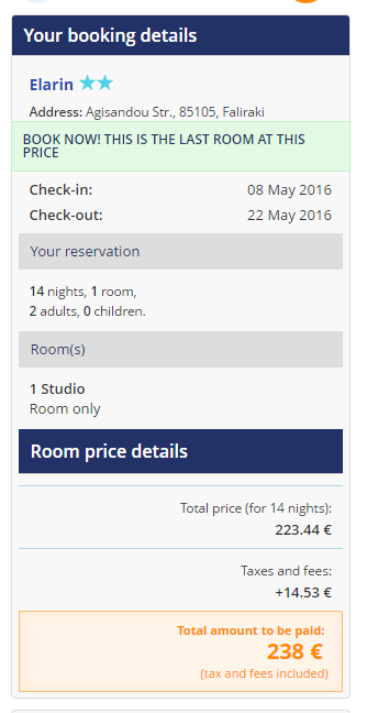 - Elarin Studios & Apartments (2-tärni). Kahese toa hind antud perioodil koos maksudega on 238 eurot ehk 119 eurot inimese kohta. Broneeri hotell SIIT