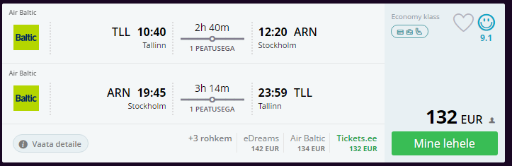 Tallinnast sobib lend airBalticu aegadega, vaata SIIT (132€) (10:40 – 12:20 / 19:45 – 23:59). Kasuta õige lennu leidmiseks järgmisi tingimusi: