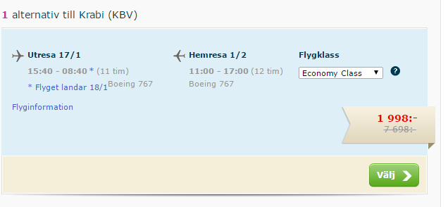 Reisikorraldaja TUI pakub häid viimase hetke hindasid Krabisse Tais – edasi-tagasi lennud Stockholmist 210 eurot. Lisades juurde edasi-tagasi lennu Tallinnast, tuleb hind kokku 343 eurot.